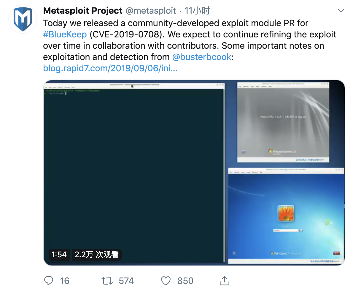 CVE-2019-0708远程桌面代码执行漏洞EXP被公开 jasonx 2019/09/10 2548 0 条 前言Windows系列服务器于2019年5月15号,被爆出高危漏洞,该漏洞影响范围较广,win...